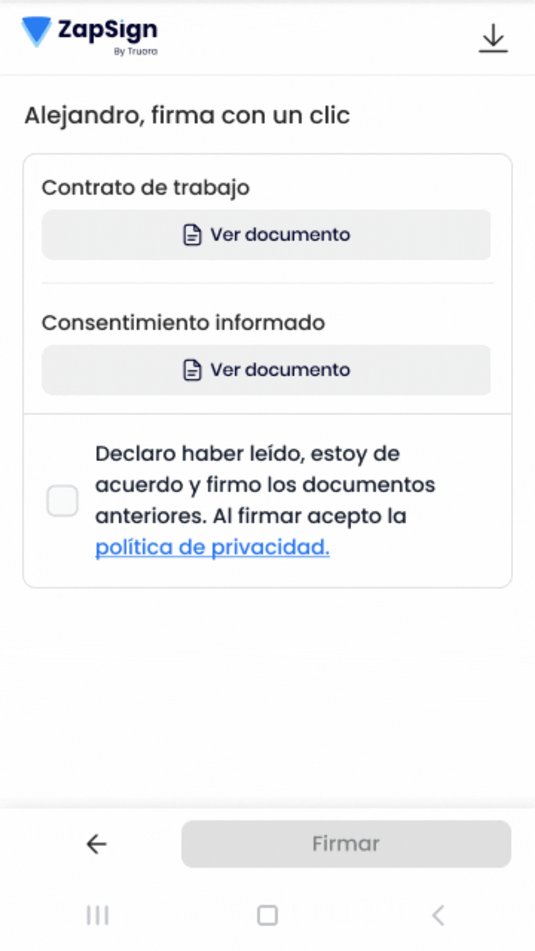 La funcionalidad OneClick de ZapSign, también conocida como acuerdos clickwrap, es una solución diseñada exclusivamente para nuestra API, que **permite capturar el consentimiento de los firmantes con un solo clic**. Este método simplifica la aceptación de documentos simples y de bajo riesgo, ofreciendo una experiencia rápida, fluida y totalmente integrada.